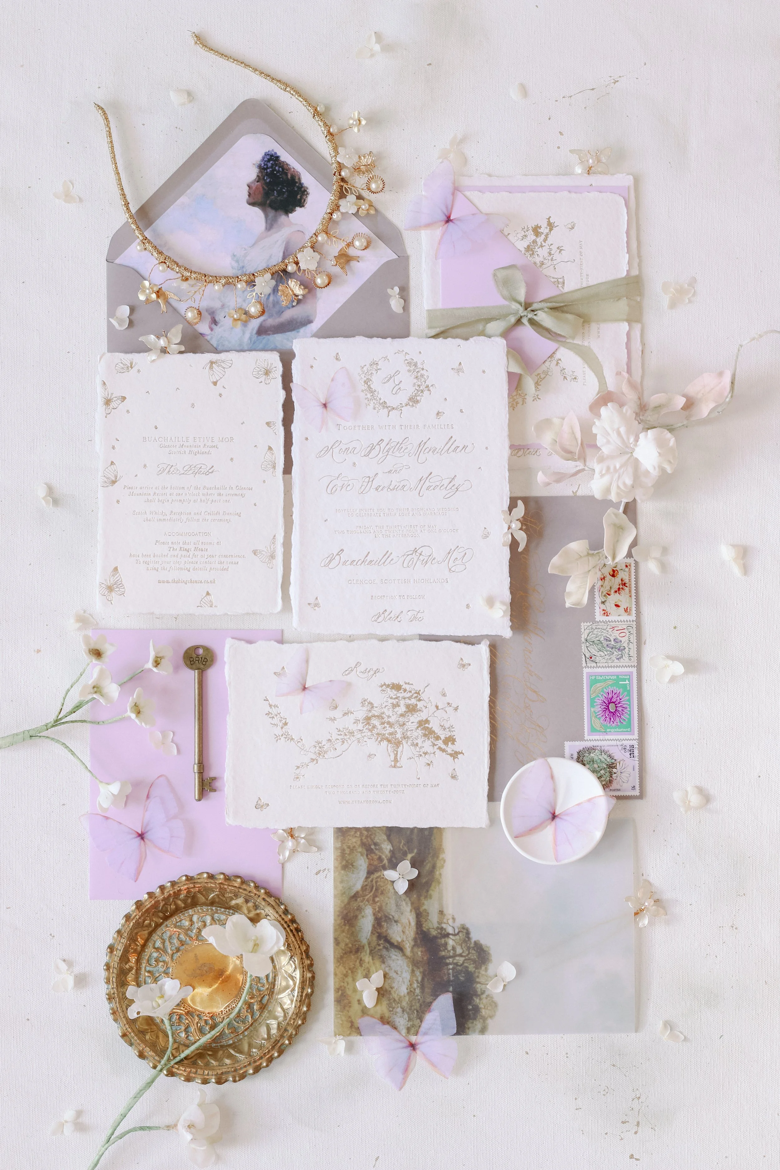 The beauty of semi-custom invitations is that it provides you with already created timeless designs with the added magic of unique personalised touches chosen by you. All of our designs are hot foil printed on luxury high GSM handmade paper and come with a standard white envelope however if you wish to add personalisations amongst the provided elements then here is what you have to look forward to: paper, calligraphy style, printing method, envelopes, liners, wax seals, vellum wraps, silk ribbon, twine, envelope addressing.